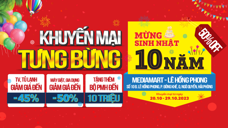 Theo đó, quý khách hàng có thể mua sắm trong chương trình “Khuyến mại tưng bừng mừng sinh nhật 10 năm MediaMart Lê Hồng Phong, Hải Phòng” diễn ra từ 20.10.2023 đến 29.10.2023 tại các hệ thống siêu thị MediaMart. Xem thêm chi tiết chương trình khuyến mại tại: https://mediamart.vn/sinh-nhat-10
