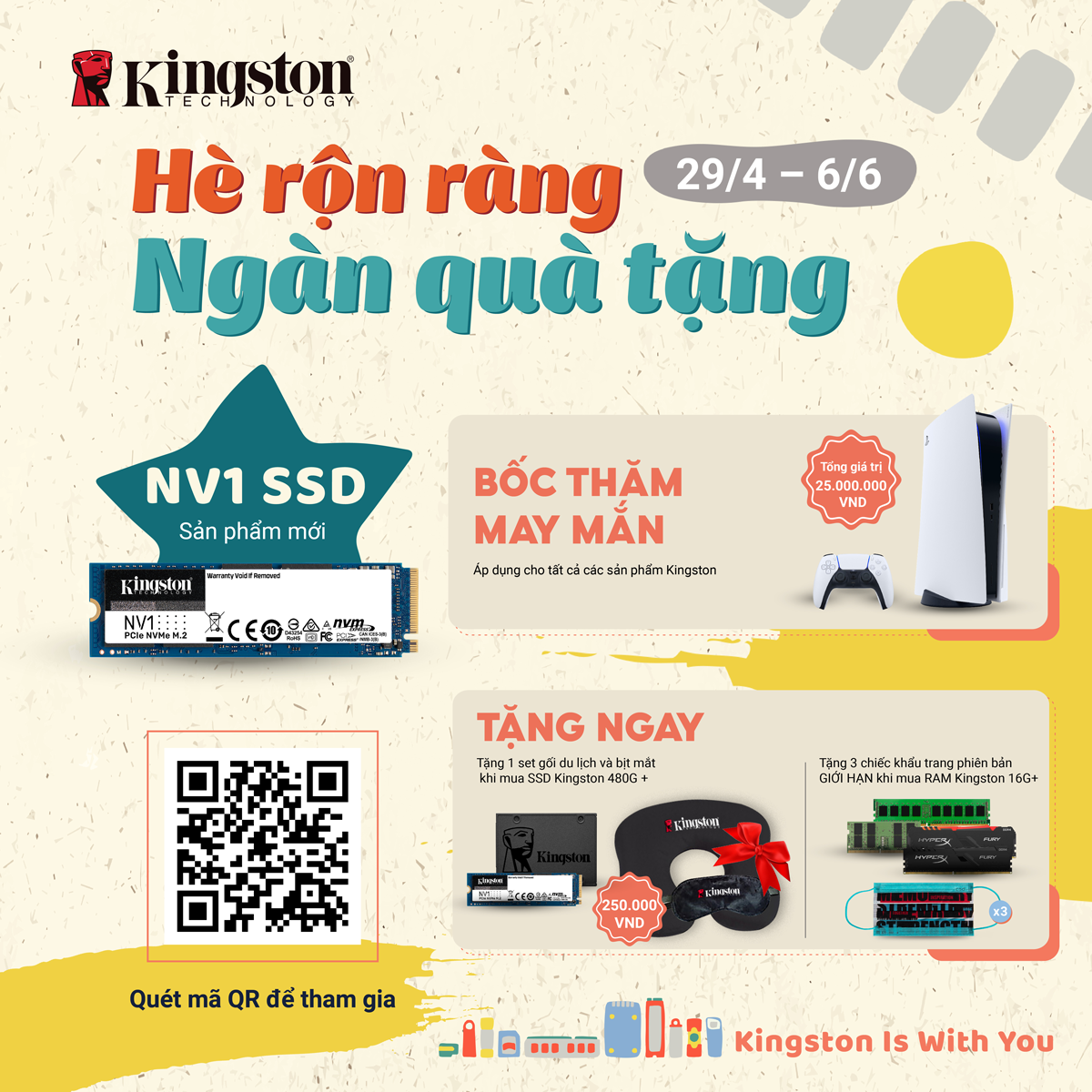 Thể lệ: Khi mua sản phẩm Kingston bất kỳ, bạn có cơ hội tham gia chương trình bốc thăm trúng thưởng các quà tặng giá trị và hấp dẫn.