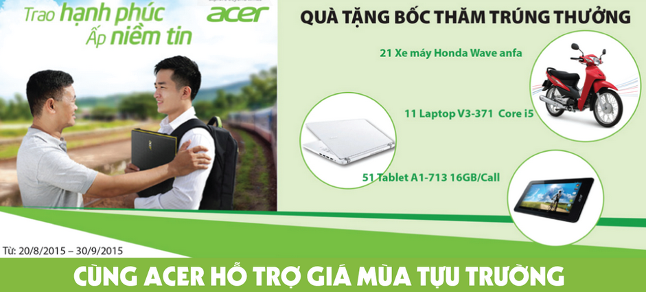 Cùng Mediamart & Acer hỗ trợ giá mùa tựu trường: Theo đó, từ 20/8/2015 đến 30/9/2015, khi mua Laptop Acer tại Mediamart, Khách hàng sẽ được tặng ngay 01 Balo Acer trị giá 200.000 VNĐ và giảm giá lên đến 1.500.000 VNĐ, đồng thời có cơ hội trúng thưởng Xe máy Honda, Laptop Acer V3 core i5, Tablet Acer A1 giá trị.