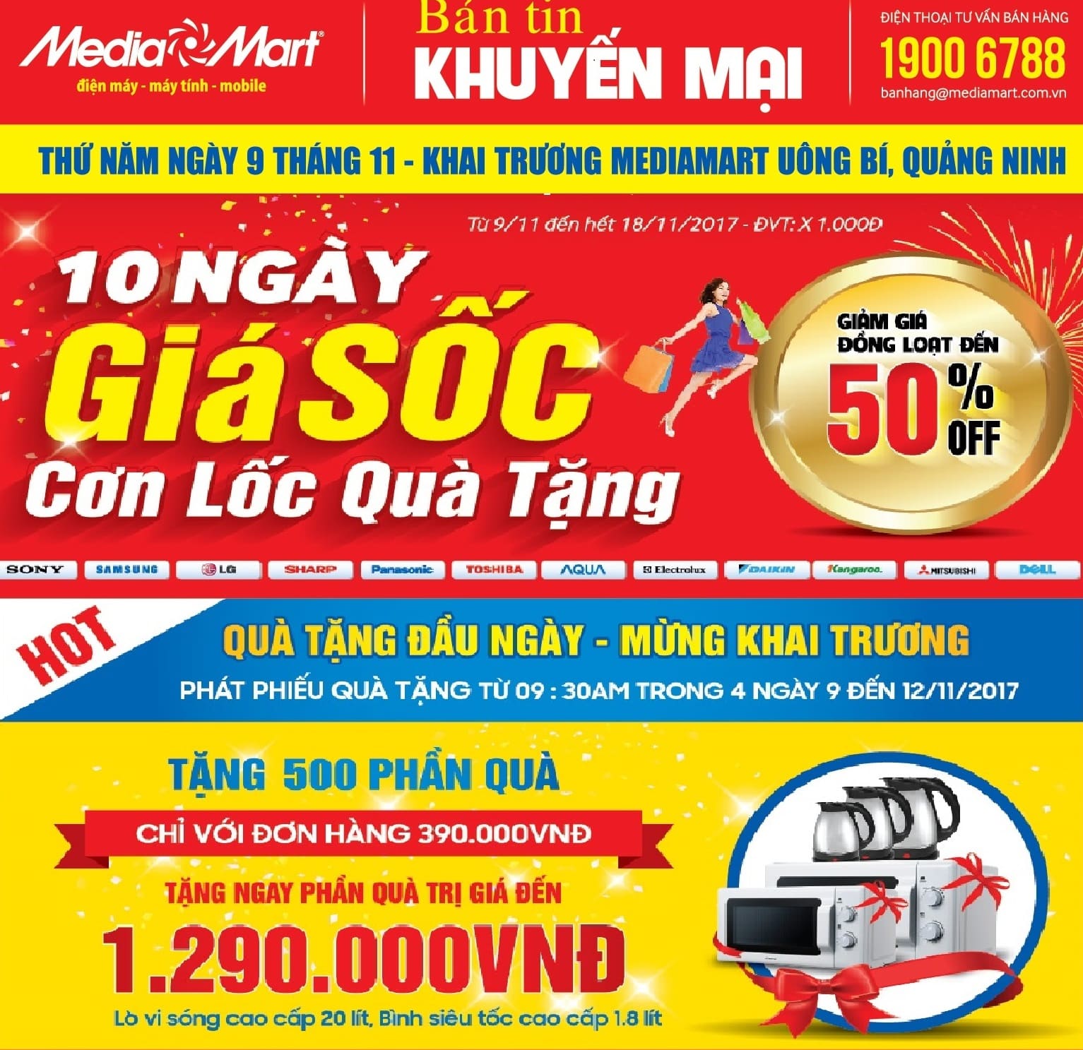 Ngày 9/11/2017, MediaMart sẽ khai trương siêu thị điện máy thứ 6 tại Quảng Ninh, cũng là siêu thị điện máy thứ 66 trên toàn hệ thống - MediaMart Uông Bí – Khu Lạc Thanh, P. Yên Thanh, TP Uông Bí, Quảng Ninh. Để chào mừng thành viên mới, MediaMart mang đến sự kiện khuyến mại lớn “10 ngày Giá sốc cơn lốc quà tặng”.