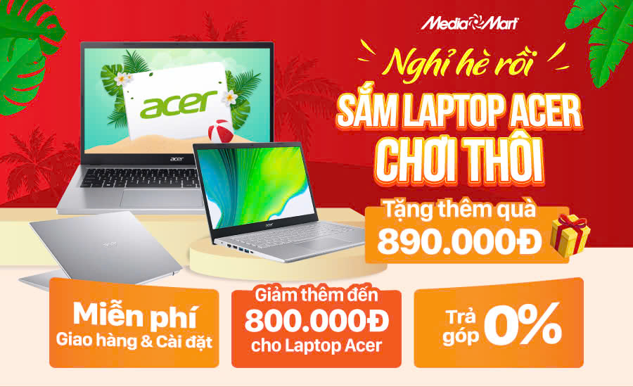 Đừng để kỳ nghỉ hè của bạn trôi qua một cách nhàm chán chỉ với những giấc ngủ hay những ngày nằm dài xem tivi, điện thoại. Hãy sắm ngay cho mình một chiếc laptop để sẵn sàng bổ sung thêm kiến thức cũng như giải trí trong những ngày này. MediaMart đang có sẵn hàng ngàn sản phẩm laptop Acer với ưu đãi giảm thêm lên đến 800.000 đồng và tặng nhiều phần quà hấp dẫn giá trị lên đến 890K trong thời gian từ 20/5 - 31/5/2025. Có laptop Acer, mùa hè sẽ trở nên thú vị và bổ ích hơn rất nhiều.