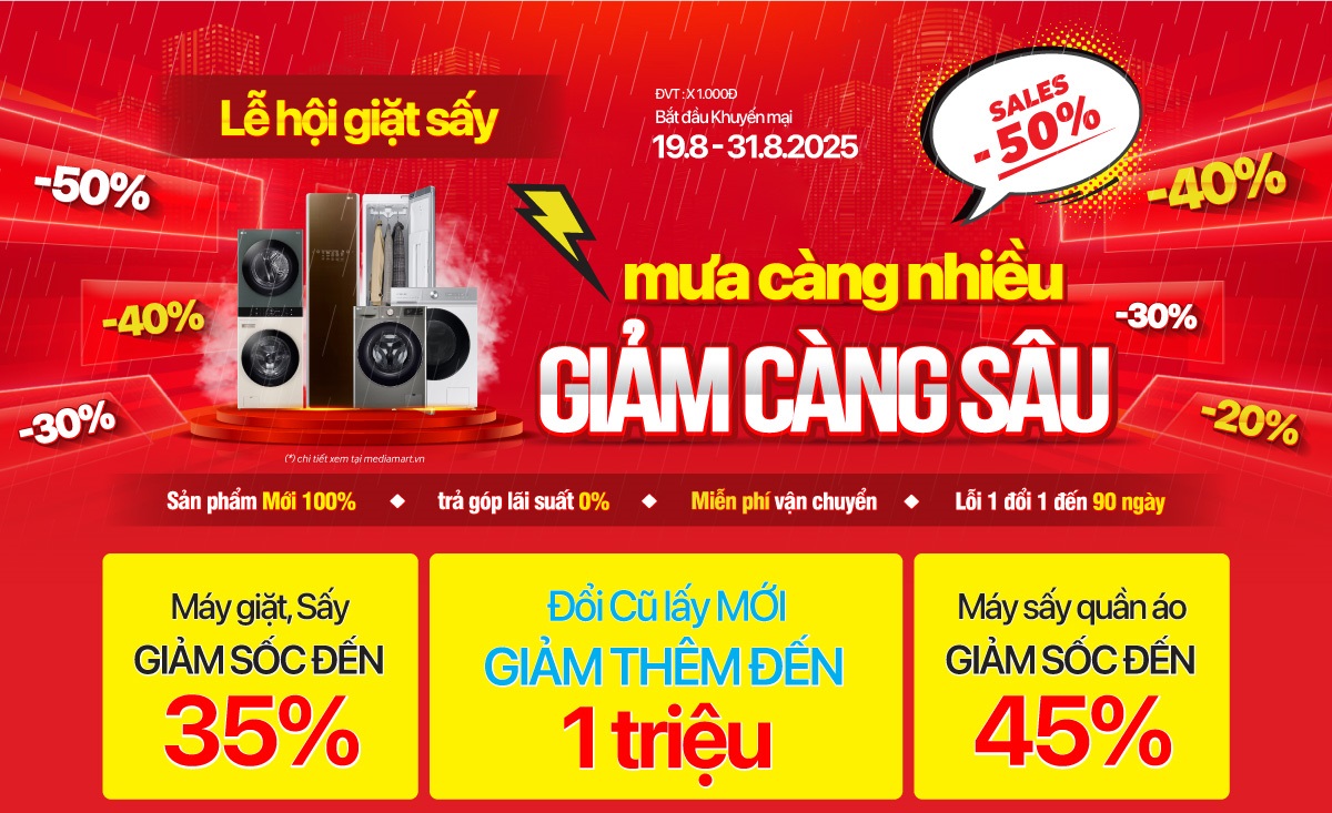 Bão to, mưa lớn, đừng lo vì đã có MediaMart! Từ 19/08 - 31/08/2025, hàng ngàn sản phẩm máy giặt, máy sấy ưu đãi lên đến 50%, combo giặt - sấy giảm thêm đến 1.500K giúp bạn tiết kiệm tối đa thời gian phơi phóng, giặt giũ quần áo hằng ngày lại không cần ưu tư quá nhiều về vấn đề tài chính. Mưa bão ơi đi nhé, vì mình đã có giặt sấy tiện nghi rồi! Check deal ngay thôi!
