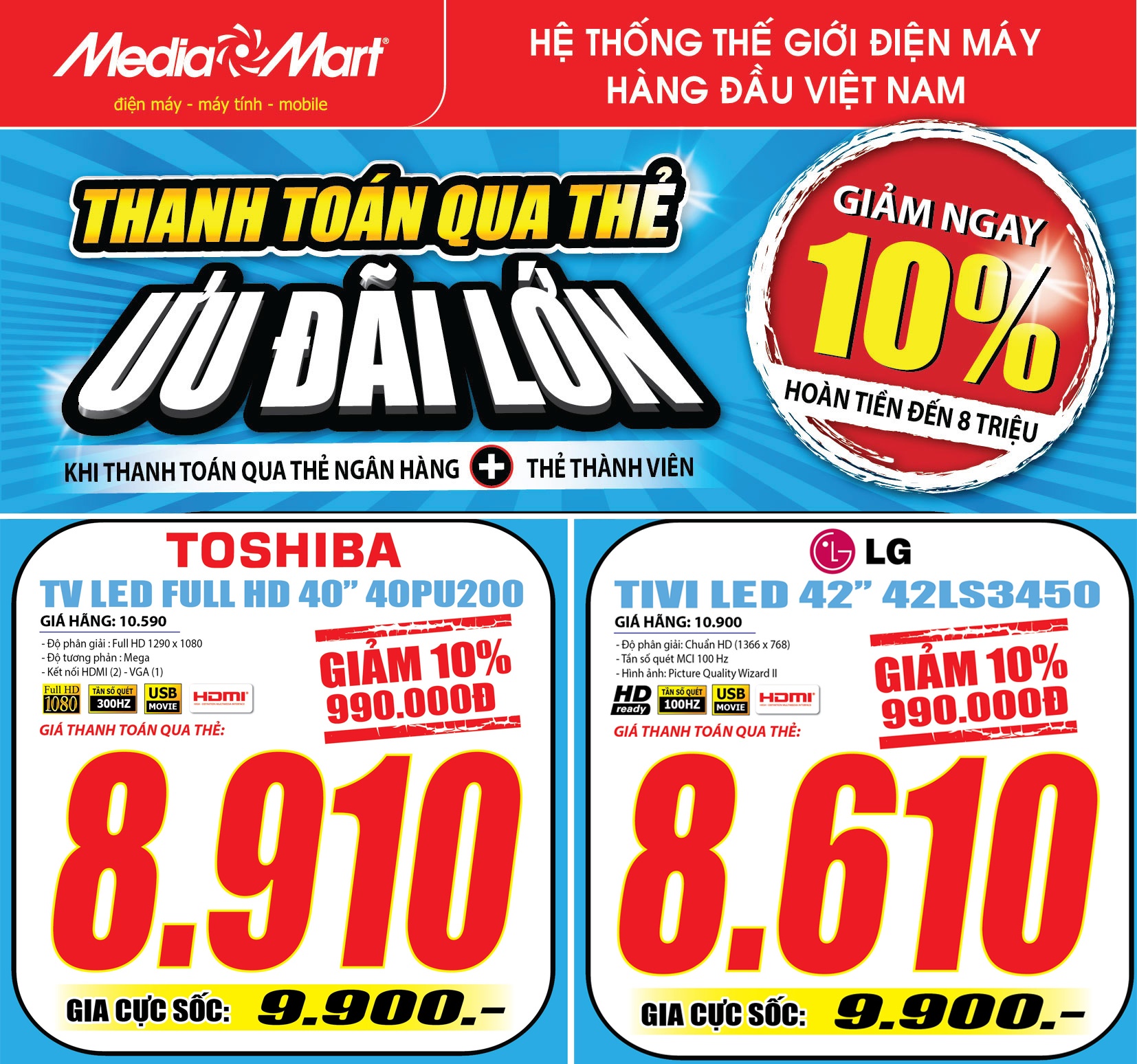 Từ 12/5 đến hết 30/5, Media Mart giảm trực tiếp 10% cho các sản phẩm TV LED. 3D các thương hiệu nổi tiếng Sony, Samsung, LG, Toshiba… khi thanh toán qua thẻ ngân hàng bất kỳ và thẻ hội viên Media Mart.