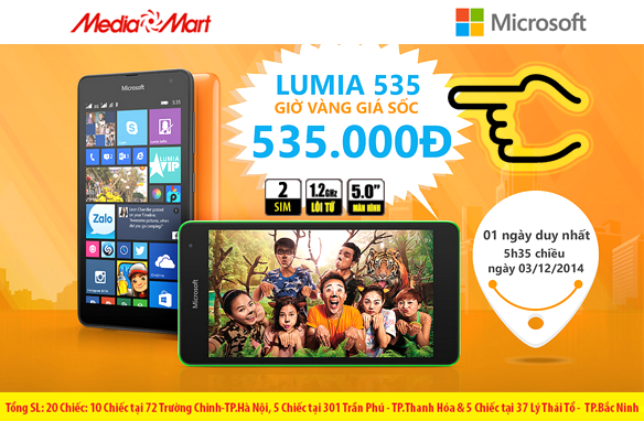 Nối tiếp chương trình "Giờ vàng giá sốc" Nokia Lumia 530 giá 530K đã được Media Mart tổ chức thành công tại Hà Nội, lần này Media Mart phối hợp cùng Microsoft tiếp tục thực hiện chương trình "bùng nổ" - Lumia 535 giá sốc nhất Việt Nam chỉ 535K tại MediaMart Trường Chinh, Bắc Ninh và Thanh Hóa.