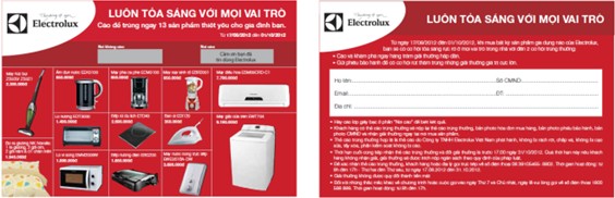 Khách hàng gửi chứng từ mua hàng gồm một phần Bảng gốc Phiếu bảo Hành (phần gửi về công ty, đính kèm bảng photo hóa đơn tài chính của sản phẩm đã mua về công ty TNHH Electrolux Việt Nam theo địa chỉ: Tòa nhà A&B, tầng 9, 76 Lê Lai, Quận 1, TP. Hồ Chí Minh, hoặc bỏ vào các thùng phiếu rút thăm trúng thưởng của Electrolux được đặt tại các siêu thị thuộc Hệ thống thế giới điện máy Media Mart để làm căn cứ rút thăm trúng thưởng. Hạn chót nhận phiếu rút thăm trúng thưởng là 01/10/2012 (căn cứ vào dấu bưu điện). Thời gian dự kiến tổ chức lễ rút thăm trúng thưởng ngày 10/10/2012.