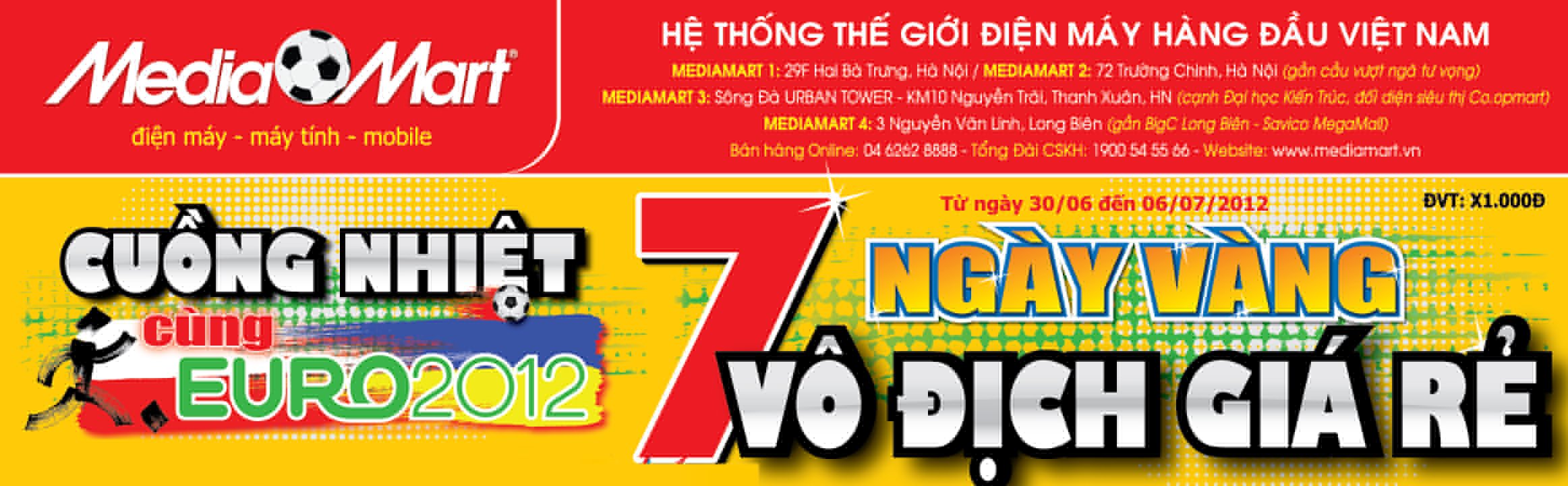 Hàng triệu tín đồ hâm mộ bóng đá đang nín thở chờ đợi đội bóng đăng quang Euro 2012. Và ngay tại Hệ thống thế giới điện máy Media Mart, từ 30/6-6/7, tất cả các mặt hàng điện tử, điện lạnh, điện gia dụng, viễn thông, kỹ thuật số, mobile… cũng đầy sôi động trong cuộc đua “7 ngày vàng vô địch giá rẻ”.