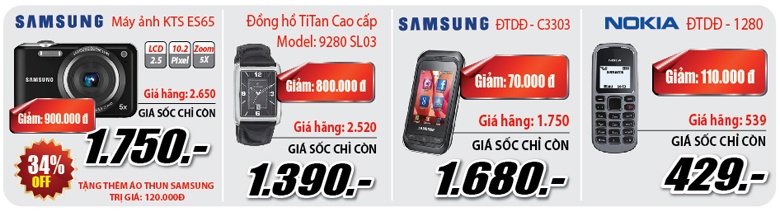 - Máy ảnh KTS Samsung ES65, giá hãng 2.650.000đ, giá sốc 1.750.000đ, tặng thêm Áo thun Samsung trị giá 120.000đ;