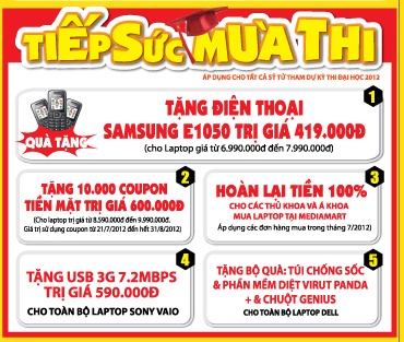 Với mong muốn tất cả các Tân thủ khoa, á khoa đều được sở hữu cho mình những chiếc máy tính xách tay là hành trang học tập và nâng cao kiến thức trong suốt quá trình học tập sắp tới của mình, Media Mart đã triển khai chương trình “Hoàn tiền 100% cho Thủ khoa, á khoa kỳ thi đại học, cao đẳng 2012”. Theo đó, các thủ khoa, á khoa của các trường đại học, cao đẳng công lập trong kỳ thi đại học cao đẳng 2012 sẽ được hoàn tiền 100% các hóa đơn mua laptop tại Media Mart từ 7/7 đến 20/7.