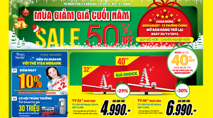 Bước vào mùa mua sắm cuối năm 2015, Hệ thống thế giới điện máyMedia Mart khởi động sớm với hàng loạt chương trình ưu đãi giảm giá đến 50% mang lại nhiều lợi ích thiết thực cho người tiêu dùng trong thời điểm Noel và năm mới cận kề.