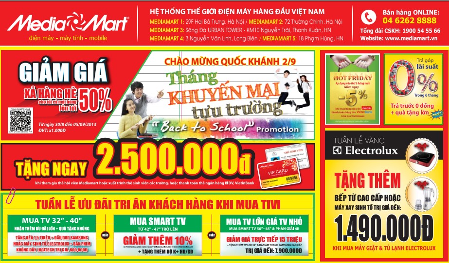 Chào mừng Quốc khánh 2/9, Hệ thống thế giới điện máy Media Mart tặng ngay 2,5 triệu đồng cho khách hàng phát hành thẻ thành viên, thẻ ngân hàng BIDV, Vietinbank hoặc thẻ sinh viên, giảm giá tới 49% tất cả các mặt hàng, giảm thêm 5% khi thanh toán qua thẻ Vietinbank…