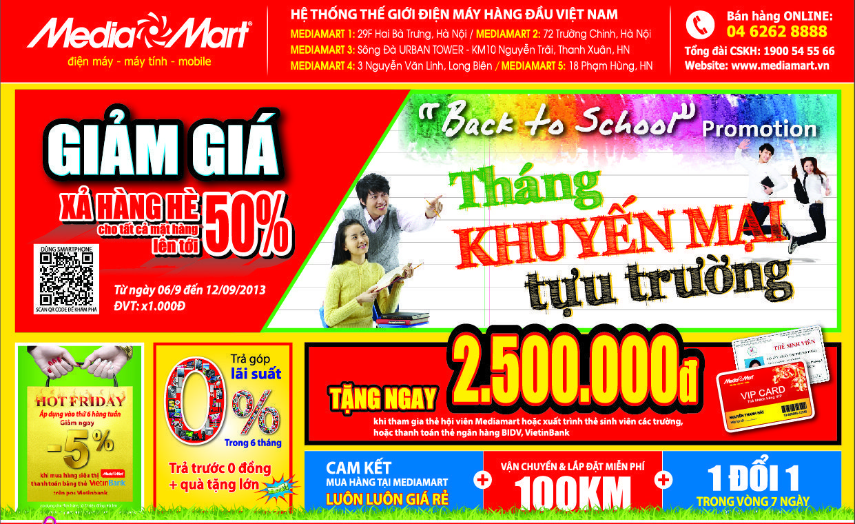Tặng 2,5 triệu đồng tiền mặt, tặng 2000 ổ cứng trị giá 1 triệu đồng cho laptop, mua tivi lớn giá tivi nhỏ, giảm giá 49%, giảm tiếp 5% khi thanh toán qua thẻ ngân hàng… là những quyền lợi hấp dẫn mà khách hàng sẽ nhận được khi tham gia mua hàng trong tuần lễ tri ân khách hàng “Giảm giá –xả hàng” diễn ra từ 6/9-12/9 tại các trung tâm thuộc Hệ thống thế giới điện máy Media Mart.