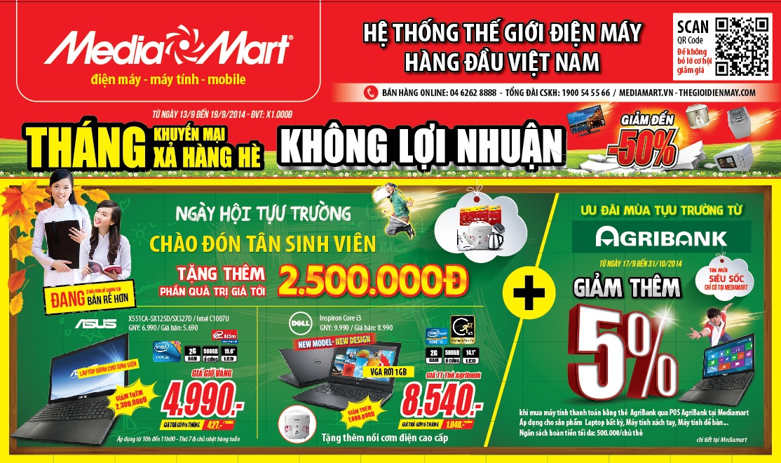 Hưởng ứng chỉ đạo của Sở công thương về việc tổ chức chương trình “Tuần khuyến mại sinh viên”, Hệ thống thế giới điện máy Media Mart khởi động sớm với gói hỗ trợ hàng tỷ đồng mang đến nhiều ưu đãi thiết thực cho các bạn HS-SV trên toàn quốc: Giảm đến 49% giảm tiếp 5% khi thanh toán qua thẻ Agribank, tặng bộ quà 2,5 triệu đồng cho sinh viên các trường đại học, cơ hội trúng 01 iPhone 5S mỗi ngày và 09 Smart TV 55’’ từ MBBank…