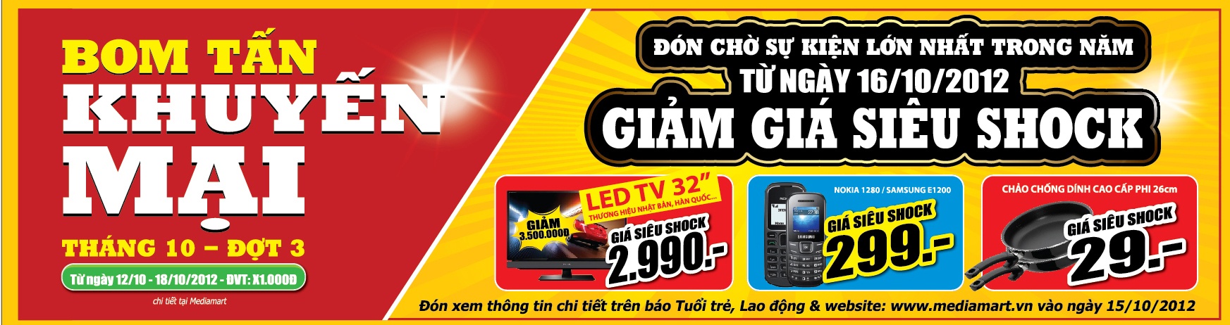 Nếu quả bom giá sốc với tổng ngân sách khuyến mại lên tới hàng tỷ đồng chưa đủ “thỏa” cơn khát mua sắm của bạn thì hãy Đón chờ sự kiện lớn nhất trong năm diễn ra từ ngày 16/10/2012 với hàng ngàn TV LED 32’’ gía 2.990.000 đồng, ĐTDĐ Nokia 1280/Samsung E1200 giá 299.000đ, chảo chống dính cao cấp phi 26cm giá 29.000đ. Đón xem thông tin chi tiết trên báo Tuổi trẻ, Lao động và website www.mediamart.vn vào ngày 15/10/2012