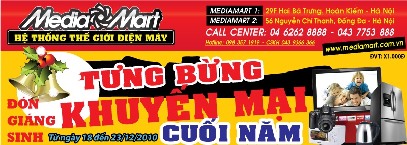 Đón Giáng sinh - Chào Năm mới 2011, từ ngày 18/12 đến 24/12/2010, Hệ thống siêu thị điện máy Media Mart tổ chức chương trình khuyến mại “Đón Giáng sinh – Tưng bừng khuyến mại cuối năm” tại 56 Nguyễn Chí Thanh và 29F Hai Bà Trưng.