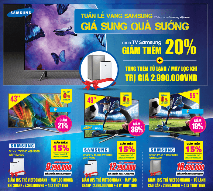 Khách hàng mua Tivi SAMSUNG giảm thêm 20%, tặng thêm tủ lạnh hoặc máy lọc khí trị giá 2.990.000đ, hoàn tiền 15% khi thanh toán qua thẻ Vietcombank, tài trợ trả góp 0% lãi suất…