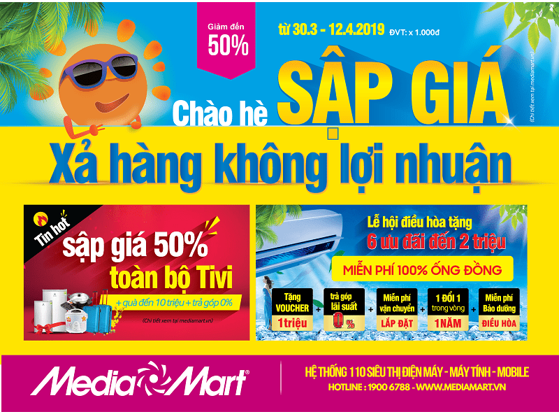 Hệ thống siêu thị điện máy MediaMart triển khai chương trình “Chào hè sập giá – Xả hàng không lợi nhuận”; với nhiều sản phẩm, dịch vụ được ưu đãi.