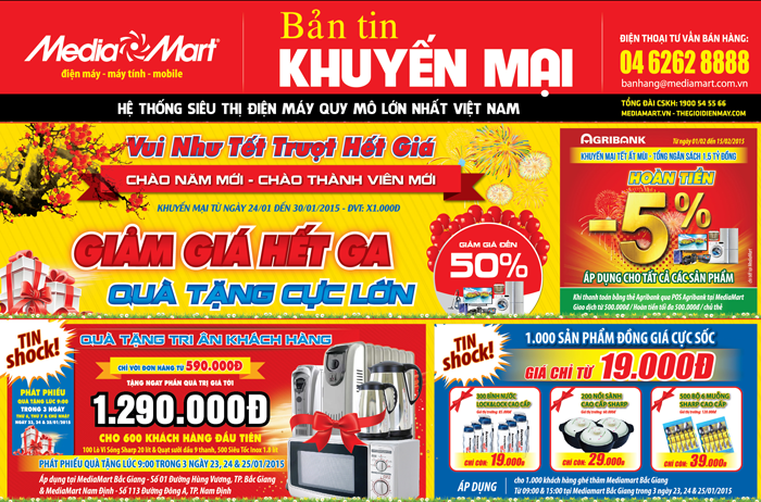 Đặc biệt, từ ngày 24/1 đến hết 30/1, tại tất cả các trung tâm thuộc hệ thống Thế giới điện máy Media Mart, 20,000 sản phẩm TV LED, máy giặt, tủ lạnh, laptop, smartphone, máy ảnh, lò vi sóng, bếp từ… có mức giảm giá từ 25-50% chắc chắn sẽ thu hút đông đảo người tiêu dùng