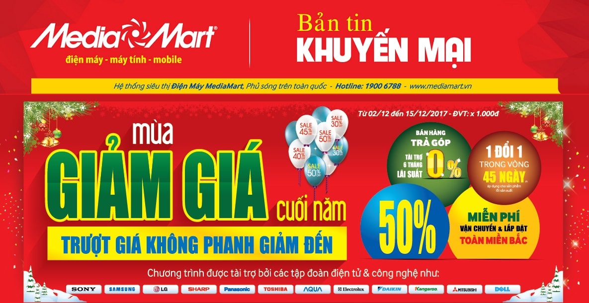 Hệ thống thế giới điện máy Media Mart khởi động sớm “Mùa giảm giá cuối năm” với hàng loạt chương trình ưu đãi mang lại nhiều lợi ích thiết thực cho người tiêu dùng trong thời điểm Noel và năm mới cận kề. Đợt 1 của chương trình năm nay là chuỗi ngày “ Trượt giá không phanh – Giảm giá đến 50%” áp dụng từ 2.12 - 15.12.2017.