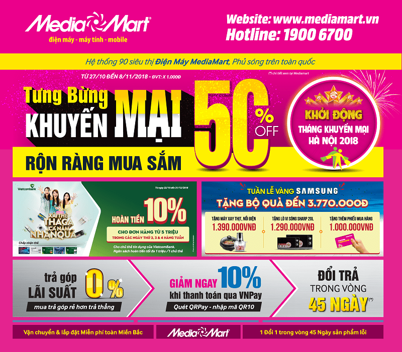 Nhân dịp kỷ niệm 10 năm chương trình, Tháng khuyến mại Hà Nội 2018 được triển khai trên địa bàn TP Hà Nội với thông điệp mới “Tăng kết nối - kích tiêu dùng” từ ngày 09/11 - 09/12/2018. Khởi động Tháng khuyến mại Hà Nội, MediaMart tung loạt chương trình: “Tưng bừng khuyến mại – Rộn ràng mua sắm” tại chuỗi siêu thị điện máy trên toàn thành phố áp dụng từ ngày 27/10 - 08/11/2018.