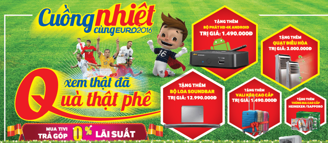 Chỉ còn ít ngày nữa, Euro 2016 sẽ chính thức khởi tranh, các siêu thị điện máy lớn như MediaMart liên tục tung ra các chương trình khuyến mại lớn dành cho nhiều mặt hàng TV, phục vụ người xem bóng đá trong nước.