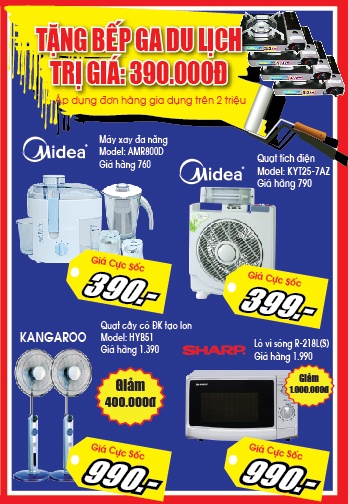- Tặng bếp ga du lịch trị giá 390.000 đồng cho tất cả đơn hàng gia dụng từ 2 triệu đồng trở lên.
