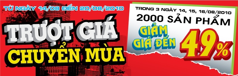 Trong 3 ngày 14,15,16/08/2010 sẽ có tới 2000 sản phẩm giảm giá đến 49%. Trong đó, có 300 TV LCD 32” & 37”/3 ngày/2 trung tâm trị giá dưới 8 triệu giảm đến 2.5 triệu.
