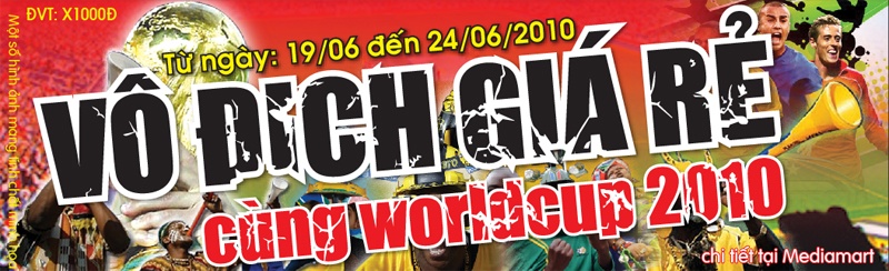 Hòa mình không khí tưng bừng và náo nhiệt của Worldcup 2010, tại Thế giới điện máy Mediamart đang tưng bừng diễn ra chương trình khuyến mại “ Vô Địch Giá rẻ - Cùng worldcup 2010” kéo dài từ ngày 19/06 đến hết ngày 24/06/2010.