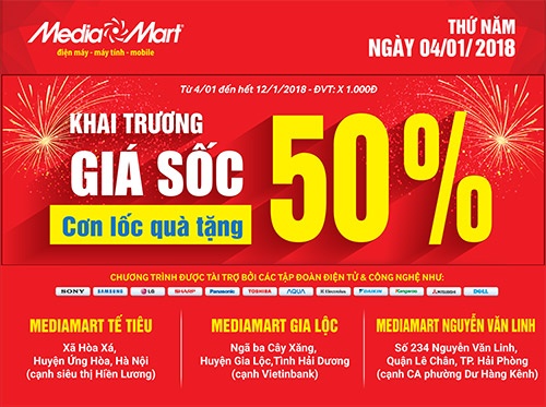 Sáng thứ 5, ngày 4/1/2018, MediaMart sẽ chào đón thêm 3 thành viên mới MediaMart Tế Tiêu – Hà Nội, MediaMart Gia Lộc – Hải Dương và MediaMart Nguyễn Văn Linh – Hải Phòng, nâng tổng số trung tâm trên toàn hệ thống lên 74 siêu thị. Nhân dịp này, MediaMart tung loạt khuyến mại tưng bừng mừng khai trương “Giá sốc cơn lốc quà tặng” kéo dài từ 4/1-12/1/2018.