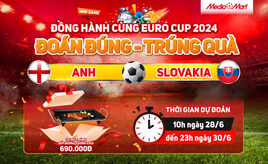 Euro 2024 đang nóng hơn bao giờ hết khi đã lần lượt xác định được những cái tên bước vào vòng 1/8. Hòa mình vào không khí sôi động của mùa giải, MediaMart tổ chức minigame "Đồng hành cùng Euro Cup 2024, ĐOÁN ĐÚNG - TRÚNG QUÀ" với nhiều phần quà hấp dẫn dành cho fan hâm mộ dự đoán đúng và nhanh nhất tổng số bàn thắng, phút ghi bàn đầu tiên trong trận đấu giữa Anh với Slovakia.