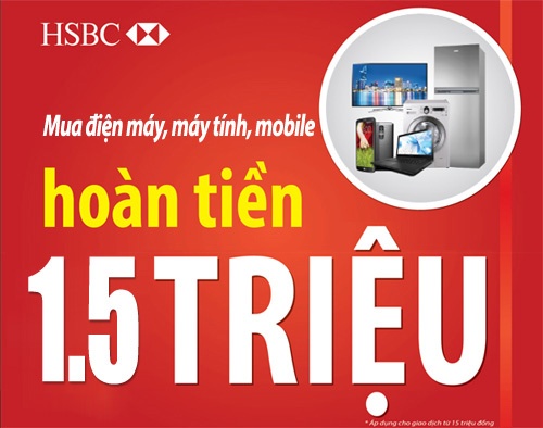 - Hoàn tiền 1,5 triệu VND khi mở Thẻ Tín Dụng HSBC Visa Bạch Kim và thực hiện giao dịch có tổng giá trị từ 1,5 triệu VND trở lên (1)