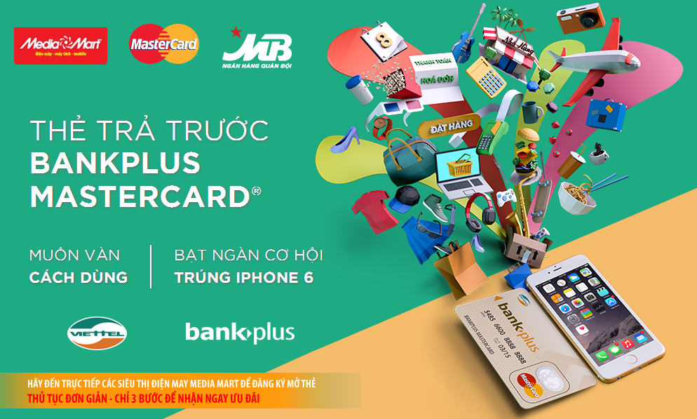 Từ 24/11/2014 đến 22/01/2015, chủ thẻ Bankplus MasterCard sẽ có cơ hội tham gia chương trình ưu đãi “Mỗi ngày trúng thưởng 01 iPhone, 6 tổng số 60 chiếc với thẻ Bankplus MasterCard”, đây là chương trình được Mediamart phối hợp với tổ chức thẻ quốc tế MasterCard & Ngân hàng CP Quân đội MB Bank đồng thực hiện.