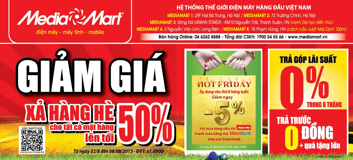 Với gói tài trợ hàng tỷ đồng đến từ các tập đoàn tài chính, các thương hiệu điện máy, máy tính, mobile nổi tiếng thế giới, Media Mart tiếp tục giảm giá xả hàng hè- giảm giá tới 50%, giảm tiếp 5% khi thanh toán qua thẻ Vietinbank, trả trước 0 đồng- lãi suất 0% tặng thêm quà tặng lớn cho tất cả các mặt hàng.