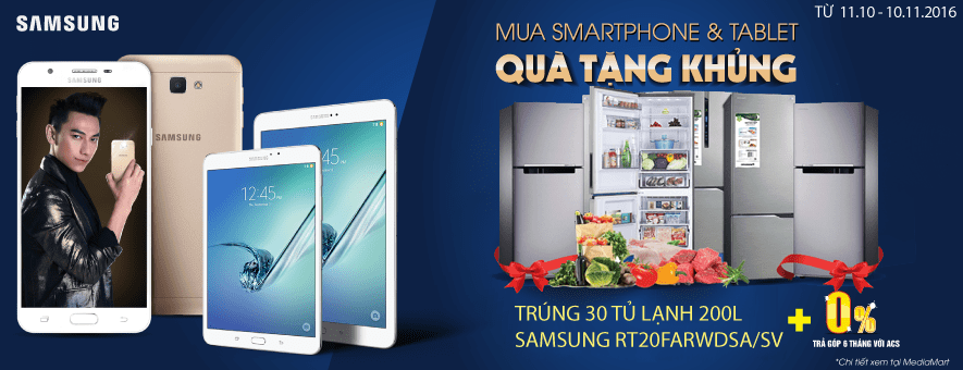 Từ ngày 11/10/2016 đến hết 10/11/2016, Mediamart phối hợp cùng hãng công nghệ hàng đầu thế giới Samsung thực hiện ưu đãi đặc biệt: Khi mua điện thoại, máy tính bảng Samsung tại Hệ thống Siêu thị điện máy Mediamart trên toàn quốc, quý khách hàng sẽ có cơ hội trúng 30 Tủ lạnh Samsung 200L cao cấp.