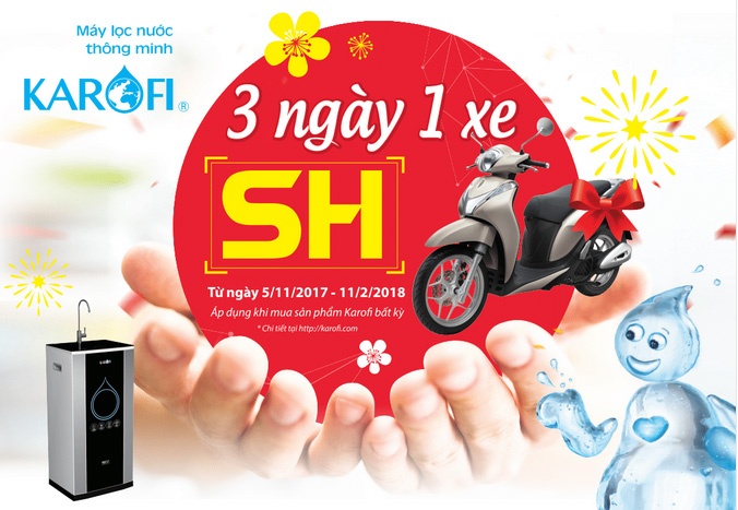 Chào mừng tháng khuyến mại, chuẩn bị cho mùa giảm giá cuối năm và đón năm mới 2018, MediaMart phối hợp cùng Karofi thực hiện CTKM "Đánh thức niềm tin" diễn ra từ 05/11/2017 - 11/2/2018. Theo đó, trong thời gian diễn ra CTKM, khi mua sản phẩm Karofi bất kì (Máy lọc nước Karofi, cây nước Karofi ...) tại Hệ thống Thế giới điện máy MediaMart trên toàn quốc, khách hàng sẽ có cơ hội Trúng 30 xe máy Honda SH mode trị giá đến 50.990.000đ.