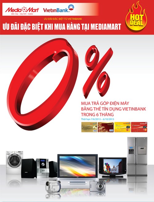 Theo đó, kéo dài từ 7/6 đến hết 6/10/2013, khách hàng mua sắm các sản phẩm điện máy tại Hệ thống thế giới điện máy Media Mart và thanh toán bằng thẻ tín dụng quốc tế Cremium Visa/Master/JCB VietinBank trên POS Vietinbank nếu có nhu cầu chuyển đổi sang thành giao dịch trả góp sẽ được hưởng mức lãi suất đặc biệt ưu đãi 0% với kỳ hạn 06 tháng.