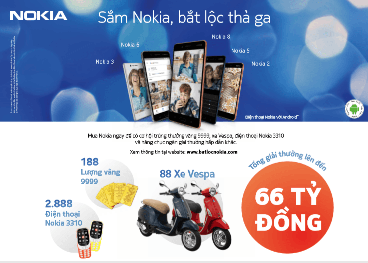 Từ 15/12/2017 - 13/02/2018, Siêu thị điện máy Mediamart và hãng Nokia đồng phối hợp thực hiện chương trình khuyến mãi đặc biệt "MUA NOKIA, BẮT LỘC THẢ GA". Theo đó các khách hàng khi mua các sản phẩm điện thoại của Nokia trong danh sách khuyến mại sẽ được tham gia chương trình và có cơ hội trúng hàng ngàn giải thưởng giá trị.