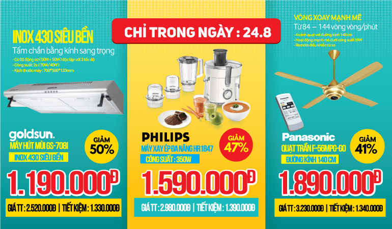 Hãy sẵn sàng đón DEAL HOT của ngày hôm nay 24/08: Hút mùi kính thẳng Goldsun 70cm GS-708/709I giảm 50% giá chỉ còn 1,190,000đ (giá niêm yết 2,520,000đ); Máy xay ép đa năng Philips HR1847 giảm 47% giá chỉ 1,590,000đ (giá niêm yết 2,980,000đ); Quạt trần 4 cánh Panasonic F-56MPG-GO-vàng,đk,Ti30-Malay giảm 41% giá chỉ 1,890,000đ (giá niêm yết 1,340,000đ). Mỗi khách hàng chỉ được mua 01 sản phẩm!
