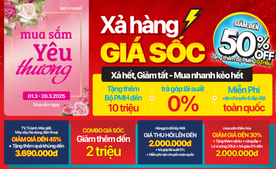 Quý khách đang tìm kiếm các thiết bị điện máy với giá tốt nhất? Đây chính là cơ hội vàng để sở hữu TV, Tủ lạnh, Máy giặt, và hàng loạt sản phẩm gia dụng với mức giảm giá lên đến 50%. Chương trình "Mua Sắm Yêu Thương – Xả Hàng Giá Sốc" tại MediaMart mang đến những ưu đãi hấp dẫn chưa từng có!