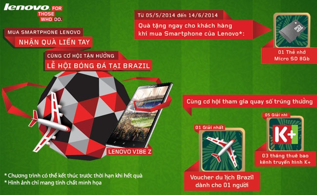 Theo đó, từ 05/05/2014 đến 16/06/2014 khi mua sản phẩm Smartphone Lenovo bất kỳ tại các trung tâm thuộc Hệ thống thế giới điện máy MediaMart trên toàn quốc, khách hàng sẽ được tham gia chương trình rút thăm may mắn trúng 01 giải nhất: Chuyến du lịch đến Brazil dành cho 01 người trong 16 ngày trị giá 179.000.000 đồng và 05 giải nhì: Gói cước Access SD 03 tháng sử dụng dịch vụ truyền hình K+ (bao gồm trọn bộ thiết bị SD và phí thuê bao trong 3 tháng) với tổng trị giá 7.225.000 đồng. Riêng với dòng sản phẩm Lenovo A269i, A369i, A516, A526, A859, A680, P780 và S650, khi mua những sản phẩm này khách hàng sẽ nhận thêm thẻ nhớ Kingmax Micro SD 8GB.