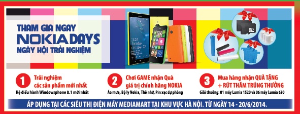 Theo đó, “Nokia Days - Ngày hội trải nghiệm” sẽ duy nhất vào Thứ 7 & Chủ nhật ngày 14 & 15/6, tại các trung tâm thuộc Hệ thống thế giới điện máy MediaMart trong phạm vi Hà Nội. Tham gia Nokia Days, các tín đồ công nghệ không chỉ được trải nghiệm những mẫu điện thoại "HOT" nhất của Nokia sử dụng Hệ điều hành Windowsphone 8.1 mà còn được tham gia những trò chơi hấp dẫn để nhận quà tặng chính hãng.