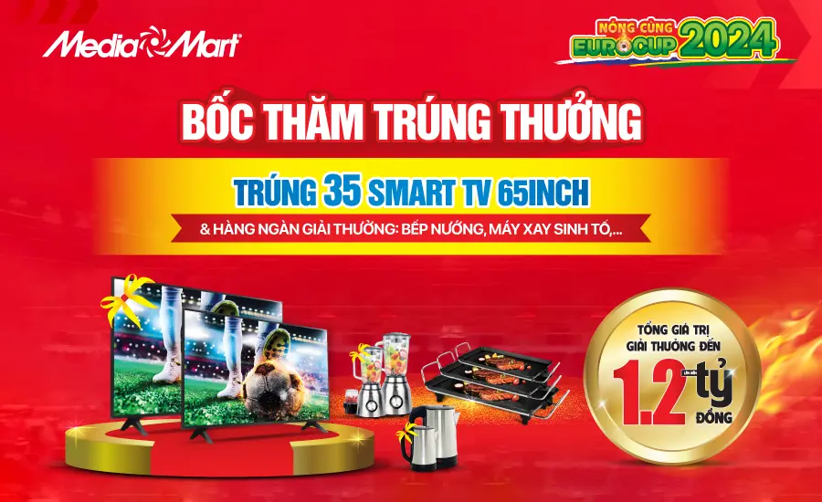 Rộn ràng mùa Euro Cup, nhu cầu mua sắm sửa của người tiêu dùng trở nên tăng cao đến mức chóng mặt, MediaMart tung ra chương trình “Nóng cùng Euro Cup 2024 – Bốc thăm trúng thưởng Smart TV 65 inch cùng hàng ngàn giải thưởng tổng giá trị 1,2 tỷ đồng”. Theo đó, khi sắm sửa các sản phẩm điện máy, công nghệ,… tại MediaMart quý khách sẽ có cơ hội bốc thăm trúng các phần quà hấp dẫn với tổng giá trị lên đến 1,2 tỷ đồng. Chương trình bắt đầu từ ngày 25/05/2024 đến hết ngày 14/07/2024.