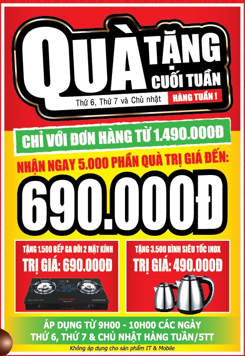 Theo đó trong 5 tuần liên tiếp từ ngày 22/2/2013 - hết 31/3/2013 vào 3 ngày cuối tuần thứ 6, thứ 7, chủ nhật, 5000 khách hàng đầu tiên có hóa đơn mua sắm từ 1.490.000đ tại Media Mart sẽ nhận ngay Bếp ga đôi trị giá 690.000đ hoặc bình siêu tốc trị giá 490.000đ.