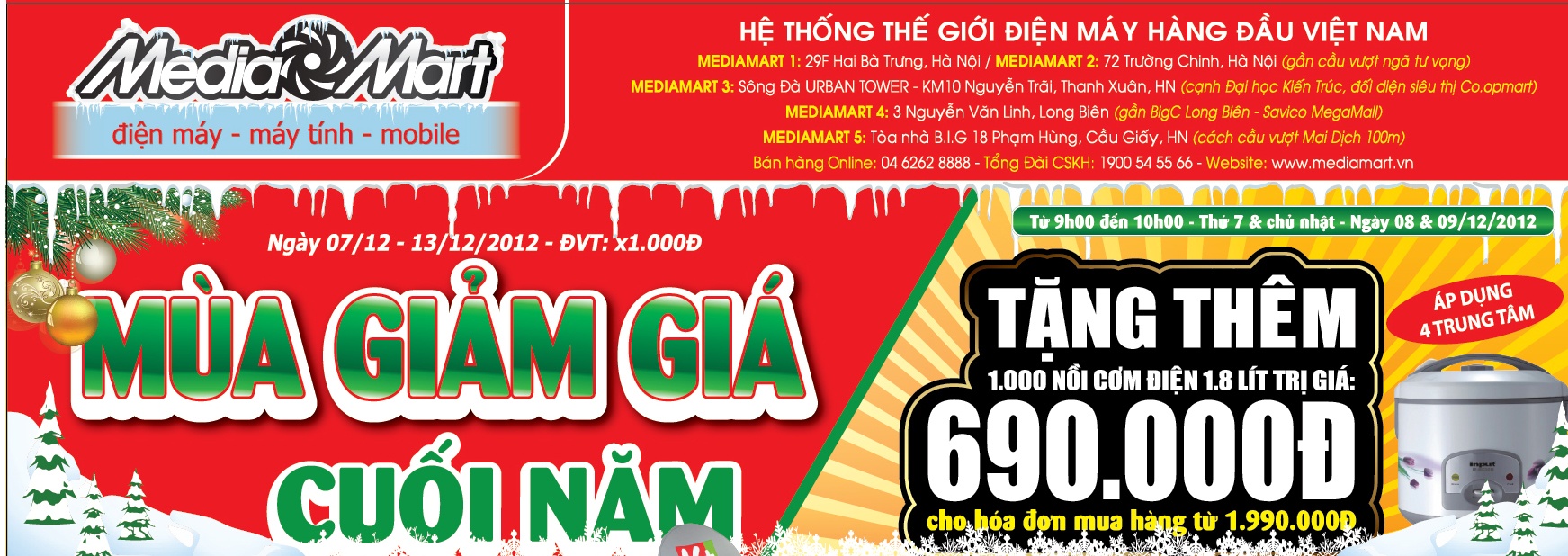 Tặng 1000 nồi cơm điện 690.000đ cho đơn hàng bất kỳ từ 1,99 triệu; tặng thêm 1000 bộ thiết bị K+ 1,5 triệu, 1000 bộ phát HD Player 2,99 triệu cho TV LED, 3D… hàng ngàn quà tặng giá trị cho Mùa giá cuối năm ngập tràn cả 4 trung tâm thuộc Hệ thống thế giới điện máy Media Mart: 29F Hai Bà Trưng, km10 Nguyễn Trãi, 72 Trường Chinh, 3 Nguyễn Văn Linh, Hà Nội