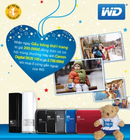 Tháng 3 - Tháng tri ân phái đẹp, Media Mart phối hợp cùng thương hiệu sản xuất ổ cứng số 1 thế giới là WD thực hiện ưu đãi tặng quà ý nghĩa thay lời chúc yêu thương gửi tới các chị em. Theo đó trong dịp này, khi mua ổ cứng WD, khách hàng sẽ nhận được ngay Quà tặng gấu bông thời trang trị giá 200,000đ, bên cạnh đó các khách hàng còn có cơ hội tham gia rút thăm may mắn trúng thưởng 04 Máy ảnh Canon Digital Ixus cao cấp trị giá 2.726.000đ.