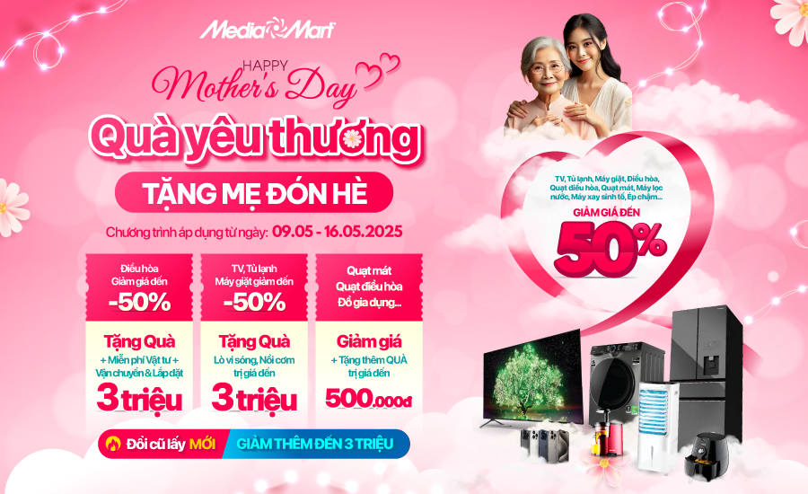 👉 Và mẹ sẽ có nhiều thời gian dành cho bản thân hơn nếu như sở hữu một căn nhà “thông minh” với nhiều sản phẩm điện tử, điện lạnh, gia dụng tiện ích giúp mẹ làm hầu hết mọi công việc nội trợ. Đồng hành cùng bạn trong Ngày của Mẹ, từ 09/5 đến 16/5/2025, MediaMart mang đến hàng ngàn sản phẩm SIÊU ƯU ĐÃI - SALE ĐẾN 50% để bạn lựa chọn làm món quà yêu thương cho mẹ. Và cũng đừng quên dành nhiều thời gian vào bếp và làm việc nhà để người phụ nữ thân yêu của gia đình bạn có thêm thời gian tận hưởng cuộc sống nhé! 👩👧👦