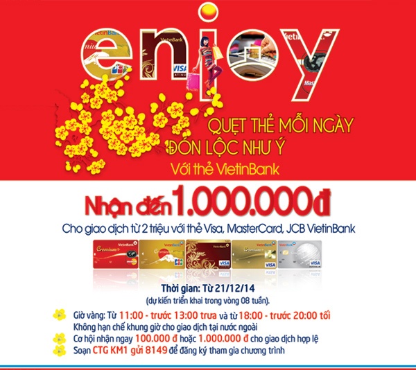 Nhân dịp Giáng sinh và đón Tết nguyên đán Ất Mùi 2015, kể từ ngày 21/12/2014, Ngân Hàng TMCP Công Thương Việt Nam (VietinBank) triển khai chương trình khuyến mãi đặc biệt mang tên “Quẹt thẻ mỗi ngày, đón lộc như ý với thẻ VietinBank” với những ưu đãi lớn dành cho chủ thẻ tín dụng quốc tế Cremium Visa/MasterCard/JCB VietinBank khi mua sắm quà tặng cho người thân và những vật dụng thiết yếu đón Tết cổ truyền của dân tộc.