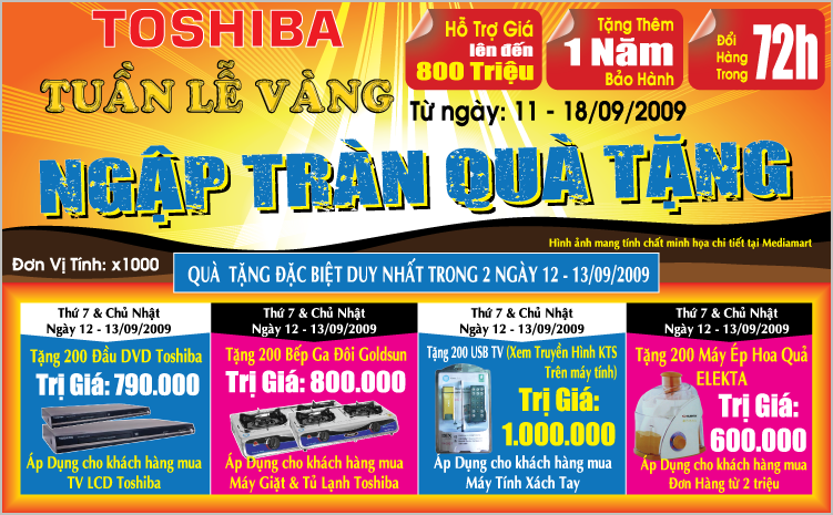 Từ ngày 11 đến ngày 17/09/2009 MediaMart thực hiện chương trình khuyến mại “Tuần lễ vàng Toshiba – Ngập tràn quà tặng”.