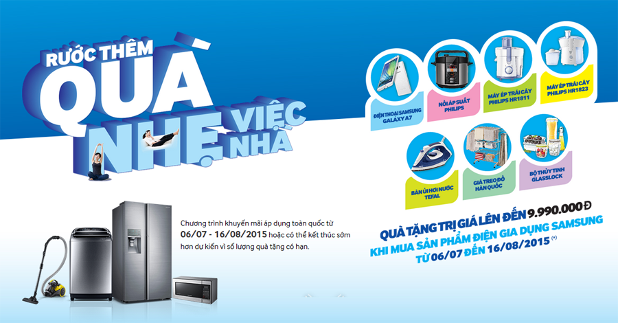 Từ 06/07/2015 – 16/08/2015, Hệ thống Thế giới điện máy Mediamart phối hợp cùng Samsung Vina thực hiện chương trình khuyến mại "Rước thêm quà, Nhẹ việc nhà" . Theo đó trong thời gian diễn ra CTKM, khi mua các sản phẩm Tủ lạnh, Máy giặt, Lò vi sóng, Máy hút bụi của Samsung tại Mediamart, khách hàng sẽ nhận được hàng loạt phần quà trị giá đến 9,990,000đ. Có thể nói, đây là chương trình hết sức ý nghĩa và thiết thực với các khách hàng nói chung và dành cho những chị em phụ nữ nói riêng.