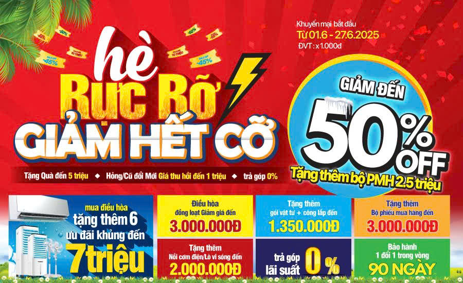 Chào đón một mùa hè rực rỡ, MediaMart trân trọng mang đến Quý khách hàng chương trình khuyến mại đặc biệt diễn ra từ ngày 31/05 đến 27/06/2025. Hàng ngàn deal giảm sâu - giảm mạnh tới 50%++ cho loạt sản phẩm điện tử, điện lạnh, gia dụng, đồ công nghệ cùng loạt quà tặng hấp dẫn chưa từng có chắc chắn sẽ mang đến cho bạn những trải nghiệm mua sắm ấn tượng và tiết kiệm. Đến và mua sắm ngay hôm nay cùng MediaMart.