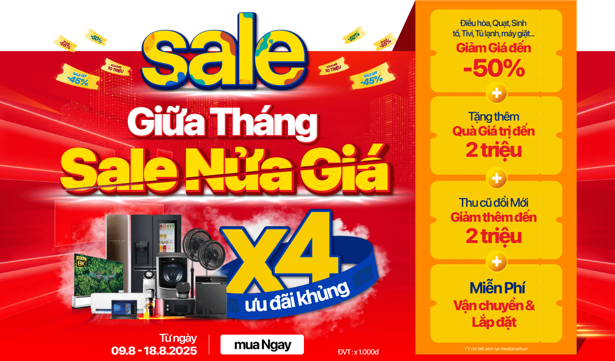Giữa tháng rồi, săn deal chưa? MediaMart khuấy động mùa mua sắm với khuyến mại Sale giữa tháng - Giảm nửa giá, giảm đến 50%++ cho hàng loạt sản phẩm điện lạnh, gia dụng, công nghệ cực hot. Mua sắm thả ga mà vẫn tiết kiệm tối đa chi phí, đây chính là cơ hội “vàng” để bạn tậu ngay điều hòa mát lạnh, laptop xịn, hay tivi màn to với mức giá không thể tốt hơn. Đừng để deal trôi qua, check ngay kẻo lỡ!